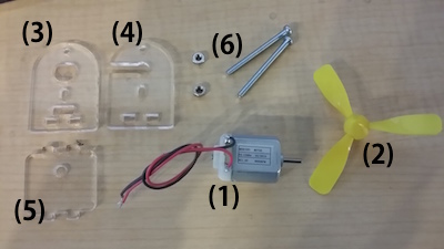 (1)サーボ、(2)~(4)アクリルパーツ、(5)M3-35mmネジ2本、M3ナット2個(鉄)