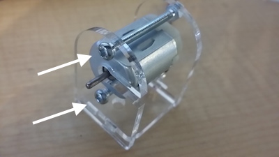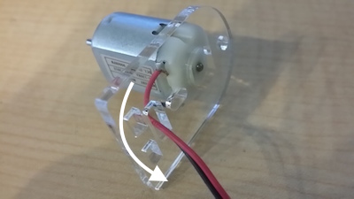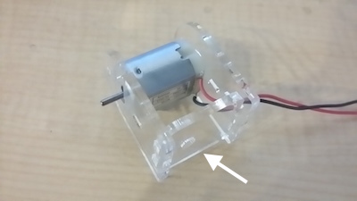 アクリルパーツ(3)をDCモーターの後ろからセットします。※DCモーターのリード線が下向きになります。