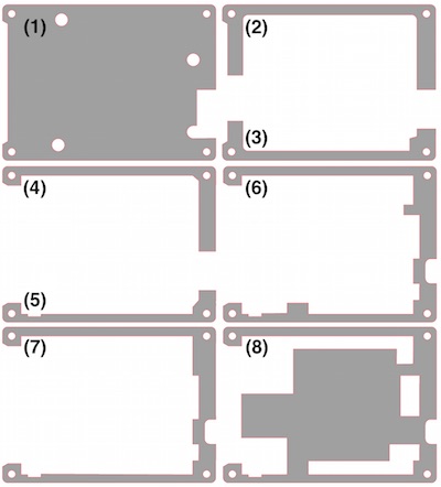 1.下から(1)、(2)、(3)、(4)、(5)を重ねます。 組み立て易くする為に、下から四方の穴にネジを差し込んでおきます。